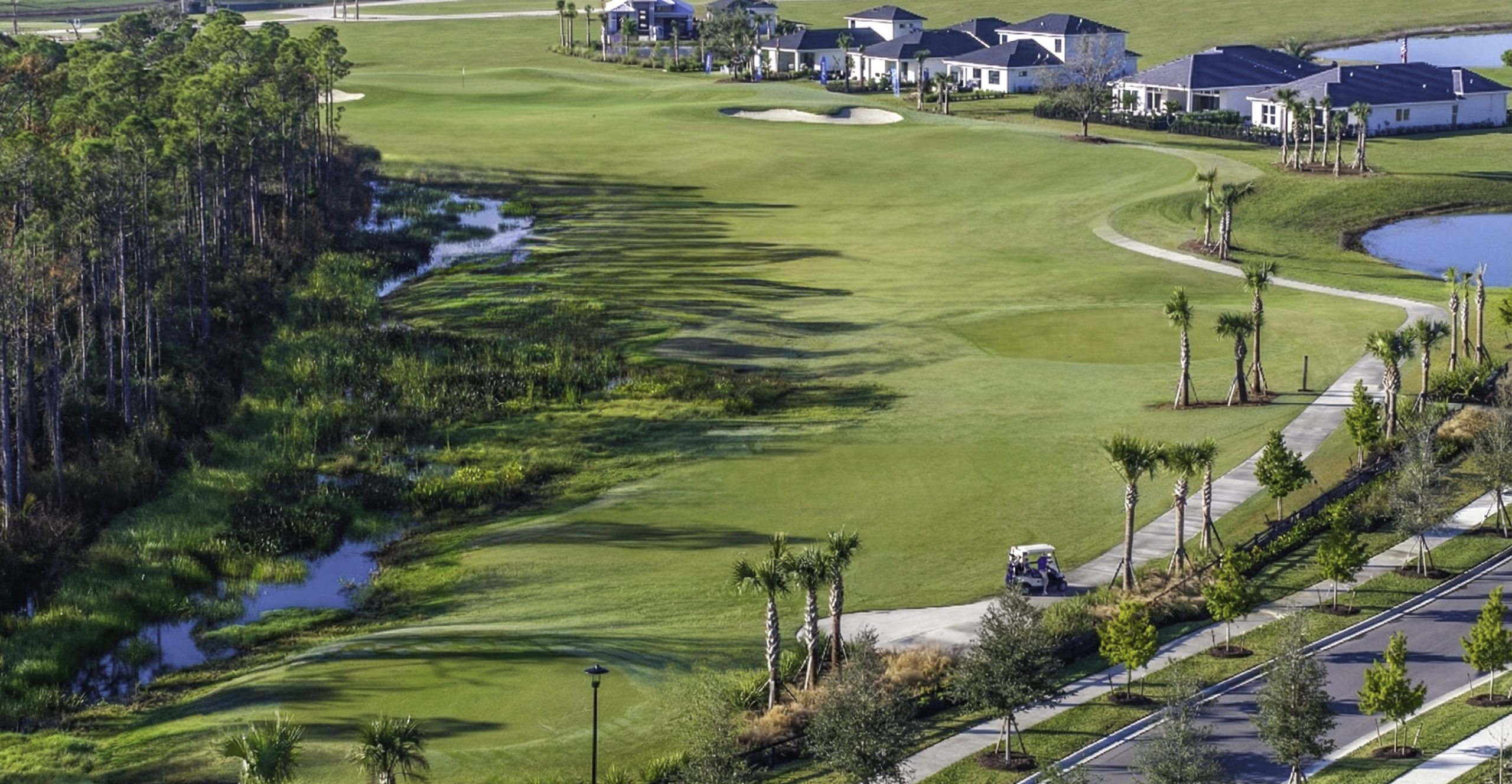 Multiple tee sets welcome golfers of varying skill levels, while fairways, ponds, and preserved wetlands follow the land’s natural movement. Woven seamlessly into the community, the course functions as both a premier golf experience and a defining element of the landscape.