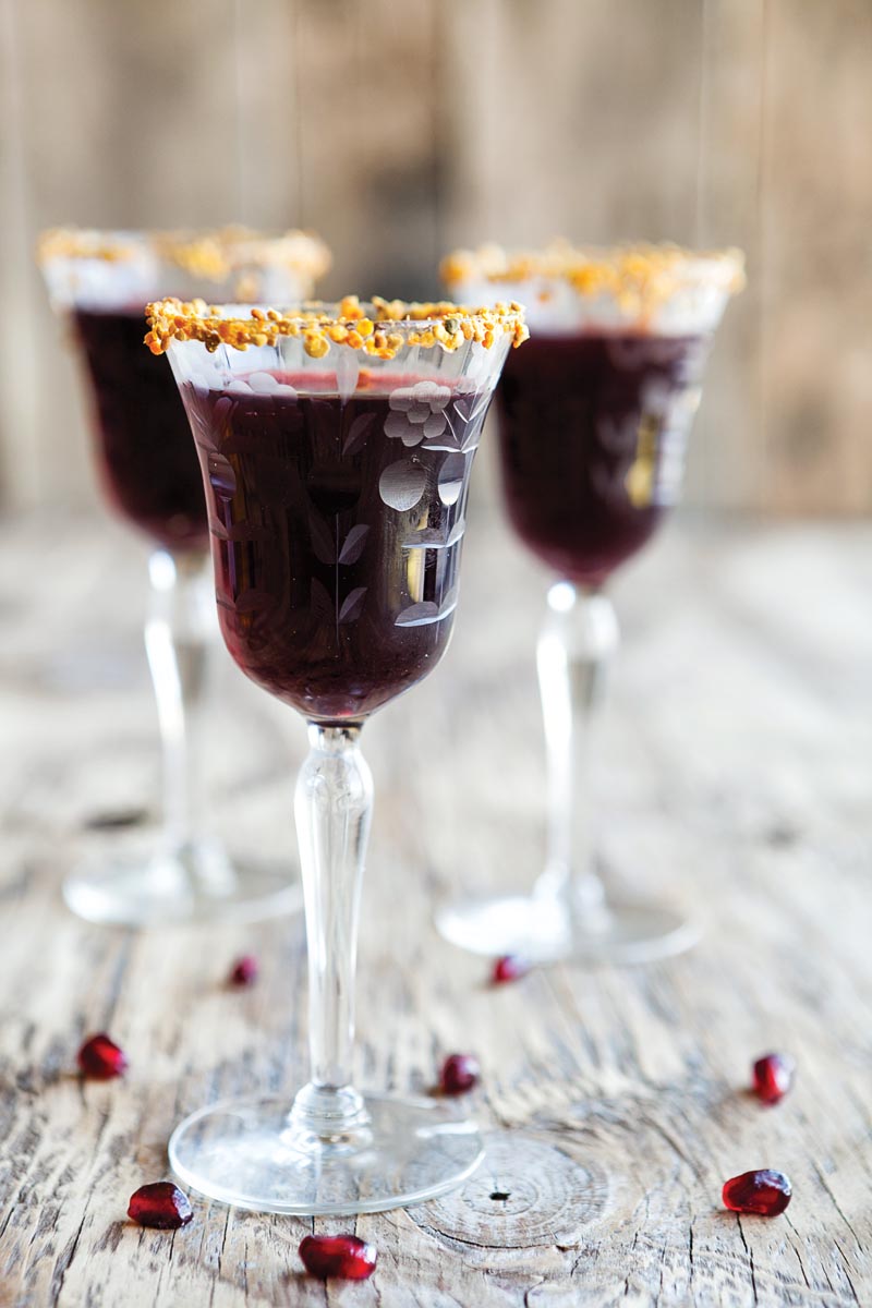 Rim a chilled glass with lemon juice and dip it into a mixture of bee pollen and sugar. Add the Calvados, dry curaçao, lemon juice, and pomegranate juice to a shaker and shake with ice until well chilled. Strain into the prepared glass. Garnish with pomegranate seeds or a twist of lemon.